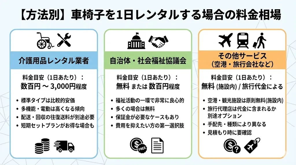 車椅子を1日レンタルする際の費用は、どの方法を選ぶかによって大きく異なります。あらかじめ料金の相場を知っておくことで、予算計画が立てやすくなります。ここでは、先にご紹介したレンタル方法別に、1日あたりの料金目安を解説します。ただし、料金は地域や業者、車椅子の種類によって変動するため、あくまで一般的な参考価格としてご覧ください。