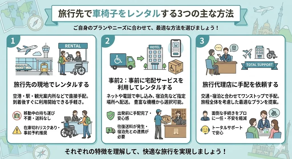 旅行先で車椅子をレンタルするには、主に3つの方法が考えられます。それぞれの方法に特徴があり、ご自身の旅行プランやニーズに合わせて最適なものを選ぶことが大切です。具体的には、旅行先の空港や駅などで直接借りる「現地レンタル」、事前に予約して宿泊先などに届けてもらう「宅配サービス」、そして旅行全体の計画と合わせて手配を任せる「旅行代理店への依頼」です。ここでは、それぞれの方法のメリットやデメリット、手配の流れについて詳しく解説していきますので、ご自身の状況に最も合った方法を見つけるための参考にしてください。