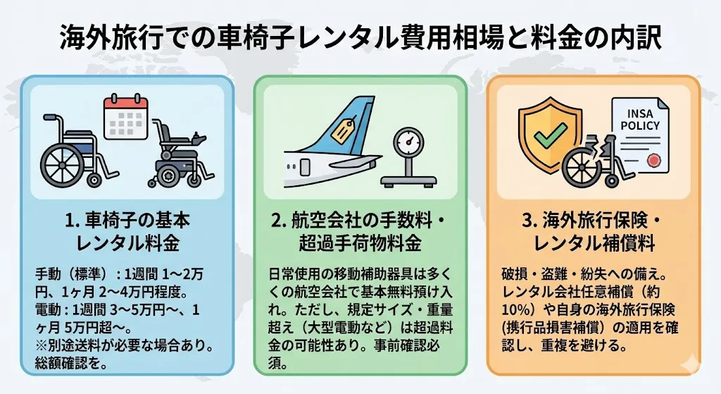 海外旅行で車椅子をレンタルする際、気になるのが費用です。レンタル料金だけでなく、それ以外にも考慮すべき費用がいくつか存在します。予算を計画する際には、基本のレンタル料金、航空会社関連の費用、そして万が一に備える保険料という、主に3つの要素を把握しておくことが重要です。ここでは、それぞれの費用の内訳と相場について解説し、トータルでどれくらいの費用がかかるのか、その全体像を明らかにします。
