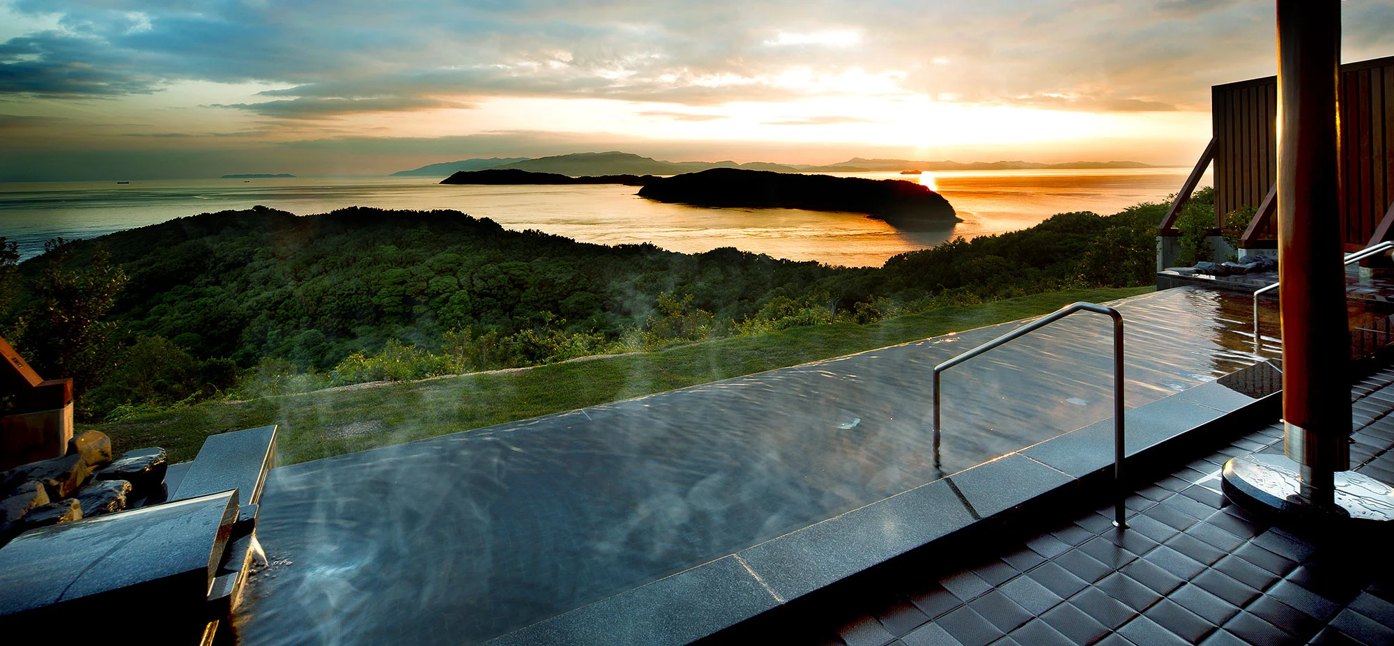 温泉もこの宿の大きな魅力で、海に溶け込むように見える露天風呂(インフィニティ感のある露天)があり、湯に浸かりながら遠くの島まで見渡せます。