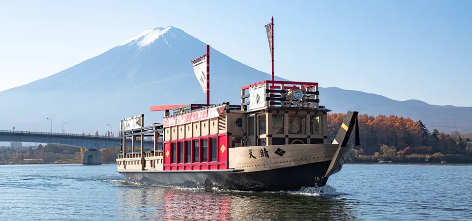 富士五湖の中で最も長い湖岸線を持つ河口湖。その湖上を優雅に進む遊覧船は、陸上からは見られない「逆さ富士」に出会えるチャンスが高いスポットです。主に運航されている純和風の遊覧船「天晴(あっぱれ)」は、車椅子やベビーカーでも利用しやすいようバリアフリー化されており、広々とした展望デッキから雄大な富士山の裾野までを一望できます。