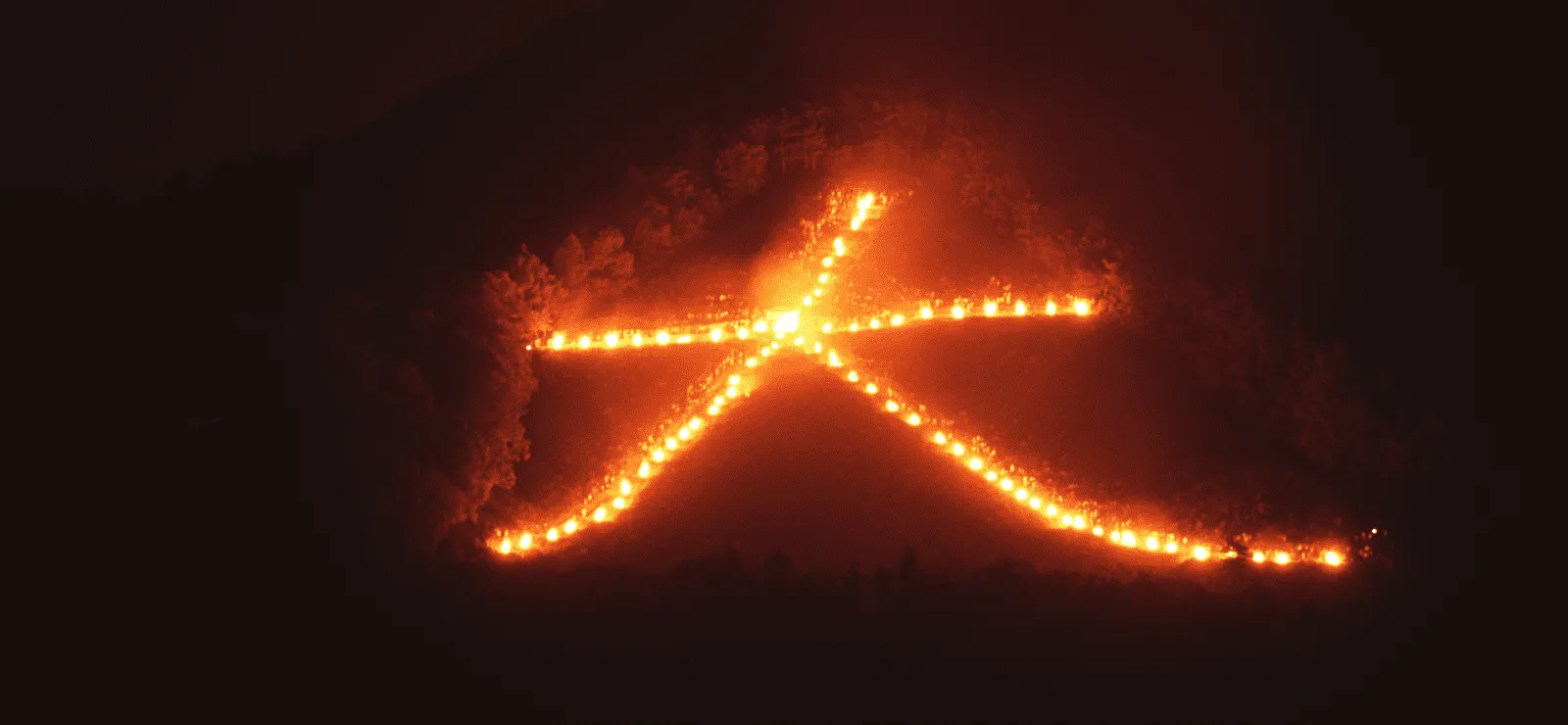 京都の夏を締めくくる伝統行事です。お盆にお迎えした先祖の霊(精霊)を再び浄土へ送り出すための宗教行事で、東山如意ヶ嶽の「大文字」をはじめ、松ヶ崎の「妙・法」、西賀茂の「船形」、大北山の「左大文字」、嵯峨鳥居本の「鳥居形」の5つの炎が夜空に浮かび上がります。