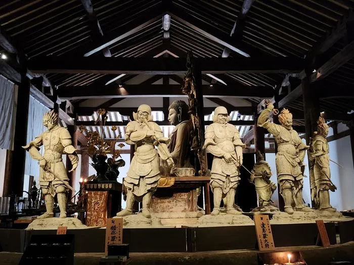 奈良公園の南側に位置する華厳宗の寺院です。本堂(国宝)の中央には薬師如来坐像が安置され、その周囲を怒りの形相をした「十二神将立像(国宝)」が守るように取り囲む姿は圧巻です。日本最古最大の十二神将として知られ、その迫力は見る者を圧倒します。比較的コンパクトな境内で、スロープ等を利用して本堂内部まで車椅子で拝観することが可能です。